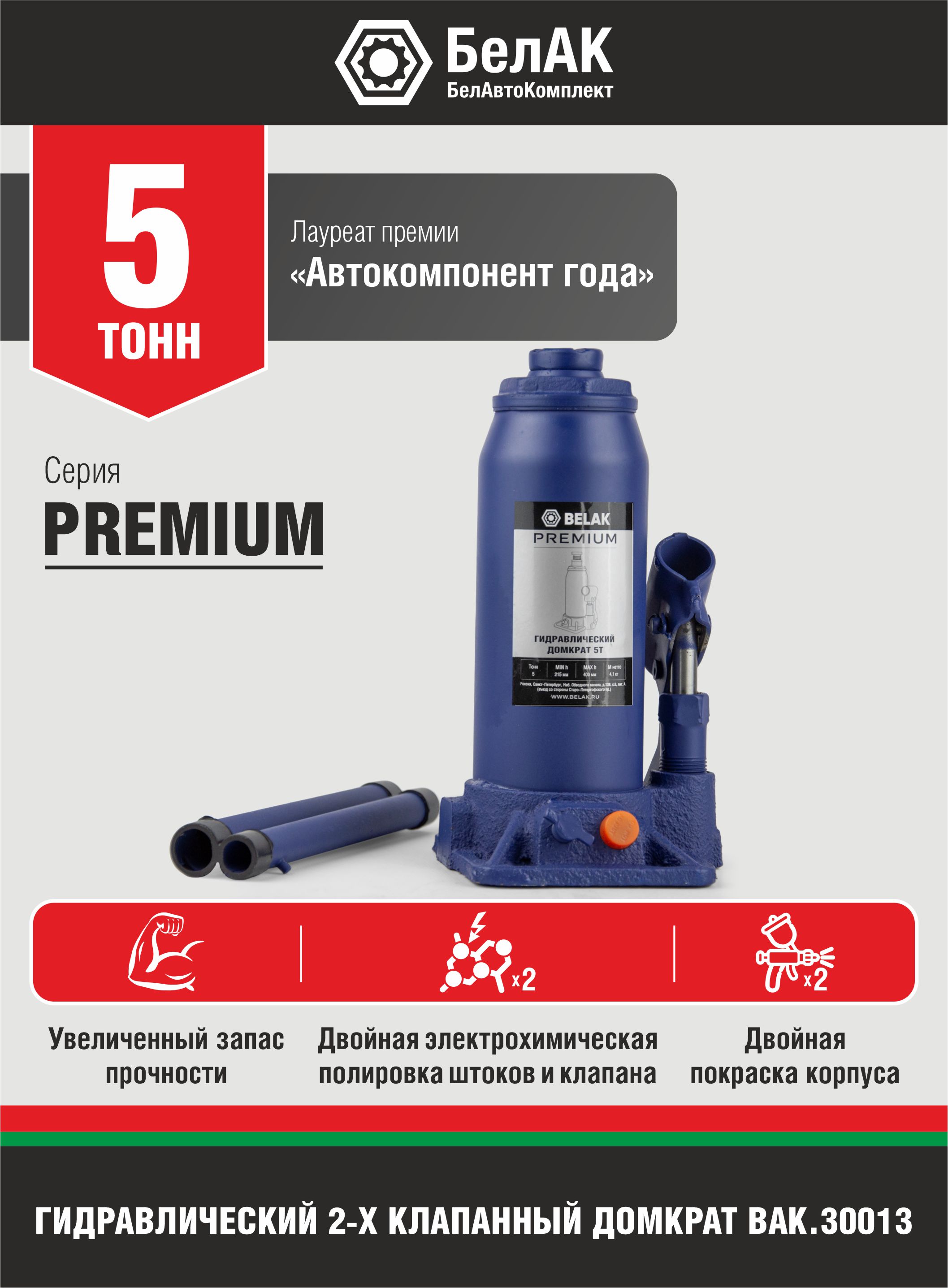 "Домкрат 5 тонн PREMIUM ""BELAK"" (TUV, 2 клапана, 215мм-400мм)" БелАК bak30013